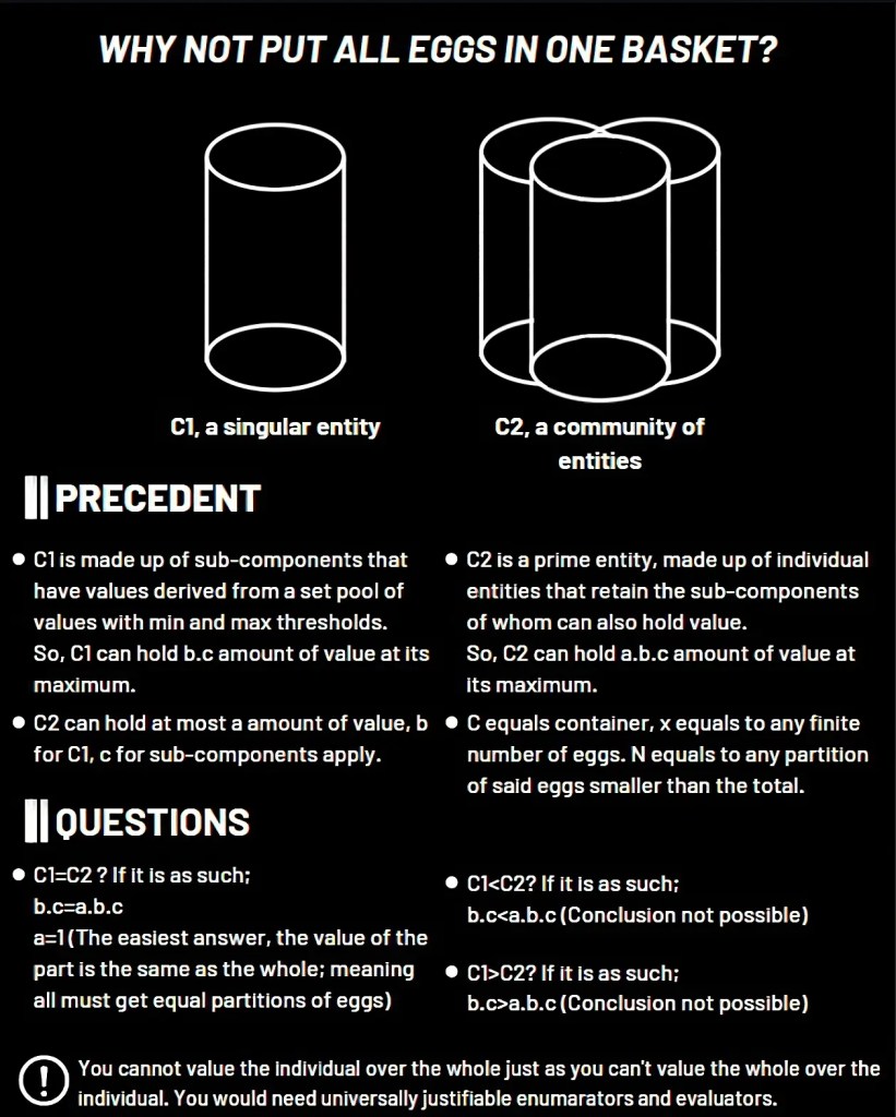 The reverse could be argued as well by most people, but both are impossible to prove since the numeric values aren’t known, and cannot be found. Human beings are inherently viewpointed, be it emotionally or logically. This makes it clear that they are not universal, but perspective-oriented evaluators, and what is universal can only, and rarely, coincide with perspective. So long as these variables aren’t weighted, it will prove impossible to ascertain how the eggs, or resources, are to be divided.